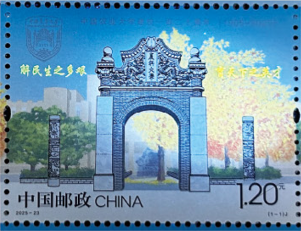 邮票采用胶雕机六色胶印+雕刻工艺,胶印部分采用原黑、天蓝、深红、中黄、专灰、银、无色荧光黄印刷,雕刻部分采用高亮高触感雕刻黑墨。在紫外灯下观察,能够看到黄色荧光校训文字。整体采用10μ调频局部调幅制版。 六色胶印赋予画面细腻表现与丰富层次,黑色雕刻将邮票中的学校建筑主体呈现在方寸之间,建筑中的每一块砖瓦都清晰展现,更加凸显出它的立体感。邮票主体背景采用高精度胶印工艺展现了丰富的树木层次关系,天空渐变过渡清晰自然。紫外灯照射可以看到“解民生之多艰,育天下之英才”无色荧光黄色的校训文字。邮票主图标题文字、校徽及年份采用高亮银墨印制,更加彰显了该套邮票的庄重与典雅。