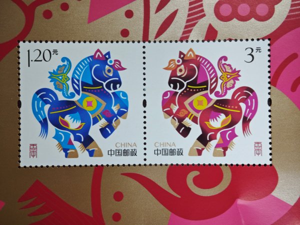 邮票采用高网线影写印制工艺,色彩饱和,画面细腻,层次丰富。使用中黄、桃红、专红、天蓝、黑、特种金属油墨六色印刷。其中,票内马的四肢、身上以及边饰部分使用特种金属油墨呈现出强烈的金属光泽,提高邮票的整体质感。在紫外线灯照射下,深红油墨发红荧光,增加了邮票的防伪性和美观性。 本套邮票一套两枚,有版式一、版式二以及小全张三种版式,两枚邮票均以马为表现主体,画面简洁,主体突出。得益于影写工艺的高饱和度和高色彩鲜艳度,邮票有着丰富的色彩表达,精准还原了原稿的鲜艳色彩,明确邮票主体。版式二及小全张以红色和金色为主题色调,边饰将用生肖马、云纹等元素进行组合设计,整体风格喜庆热烈,使得邮票整体在视觉上更加统一和谐,提升邮票整体美感。