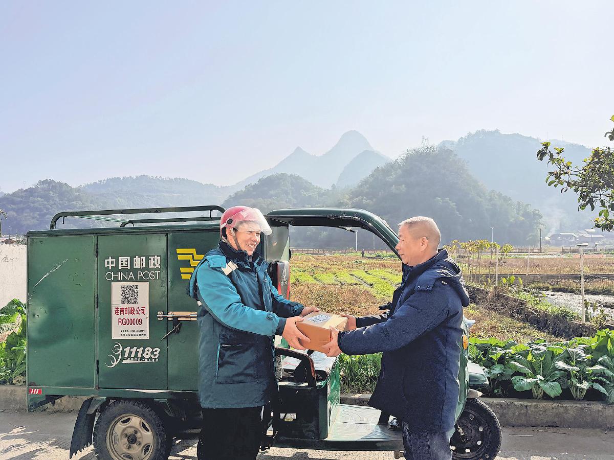 投递员唐志辉将邮件交到村民手中。 □钟桔滢 摄