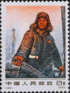 1972.12.25,影雕套印,P11.5*11,30mm*40mm,50(10*5)。[G]。 [A]:大庆工人和上海美术出版社合作。 [D]&[E]:孙鸿年 [Pr]:北京邮票厂 本套邮票共1枚,8分。邮票画面是“铁人”王进喜在工作的情景。他身着冬装,一双有力的大手正操作机器,脸上流露出自豪的神情。画面的背景是繁忙的石油建设工地。设计者使王进喜的半身像占据了几乎整个画面,以突出他的高大形象。