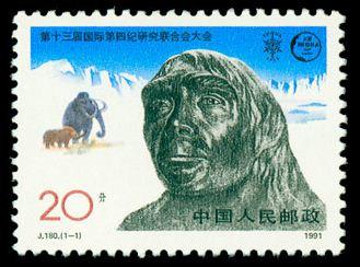 本套邮票共1枚。画面层次是以炭笔素描手法刻画北京猿人特写头像为主,以猛犸象和古犀牛为中景,并置于喜马拉雅山冰川的整体景观中。它概括了第四纪的重要生物与地貌特点。 1991.8.2。影写版。P11*11.5。 40mm*30mm。40(5*8)。 [G]。 王虎鸣。北京邮票厂。 1991年8月在北京召开的第十三届国际第四纪研究联合会大会,以“全球环境变化与人类活动的关系”作为中心议题,共同探讨保护全球环境的有效措施,寻找防止环境恶化的途径。