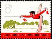 (1) 8分 刀术 600万枚 (2) 8分 剑术 600万枚 (3) 8分 拳术 600万枚 (4) 8分 枪术 600万枚 (5) 8分 棍术 600万枚 (6)43分 三节棍对双枪 200万枚 1975.6.10。影写版。P11×11.5。[G]。卢天骄。北京邮票厂。 (1)-(5)40mm×30mm、50(5×10)。 (2)60mm×30mm、30(3×10)。对倒印刷。