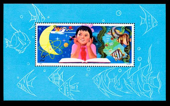2元,从小爱科学,10万枚。 1979.10.3。影写版。P11.5×11。尺寸规格148mm×90mm,邮票票幅规格90mm×40mm。[G]。邹建军。北京邮票厂。 图案是一个长着一双大眼睛的小女孩沉浸在神奇美妙的科学幻想中的情景(邮市俗称“大眼妹”)。1979年10月3日,为了反映中国少年儿童从小爱科学、学科学的活动,中华人民共和国邮电部发行一套《从小爱科学》特种邮票,全套6枚,同日发行1枚小型张。