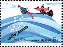 (1)8分 刻舟求剑 1165.8万枚 (2)8分 楚人涉江 1165.8万枚 (3)8分 剑坠于水 1165.8万枚 (4)8分 遂刻其舟 1165.8万枚 (5)8分 入水求之 1165.8万枚 1981.3.10。影写版。P11×11.5。40mm×30mm。50(5×10)。5枚连印。潘可明。北京邮票厂。