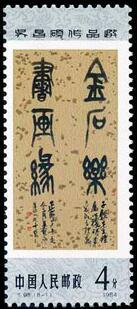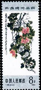 (1) 4分 书法 750.66万枚 (2) 4分 双桃 820.46万枚 (3) 8分 芙蓉 1156.86万枚 (4) 8分 紫藤 1205.26万枚 (5) 8分 牡丹 1096.86万枚 (6)10分 秋菊 956.86万枚 (7)20分 梅花 939.66万枚 (8)70分 篆刻 644.26万枚 1984.8.27。影写版。P11×11.5。25mm×60mm。40(10×4)。 [A]吴昌硕。[D]卢天骄。北京邮票厂。