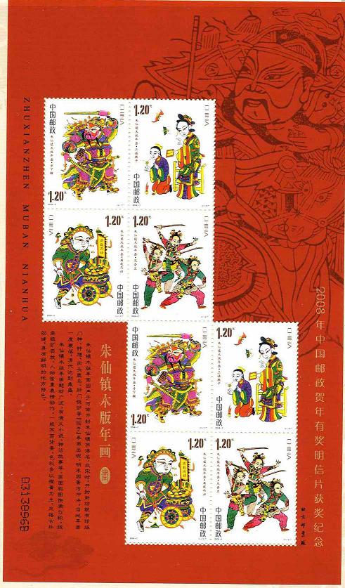 国家邮政局2008年1月15日发行《朱仙镇木版年画》特种邮票1套4枚,小全张1枚。