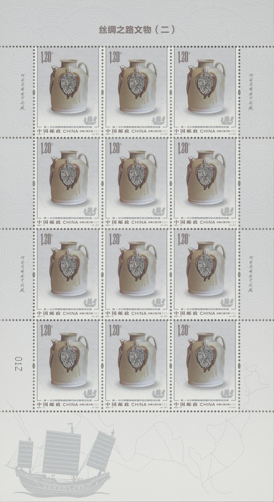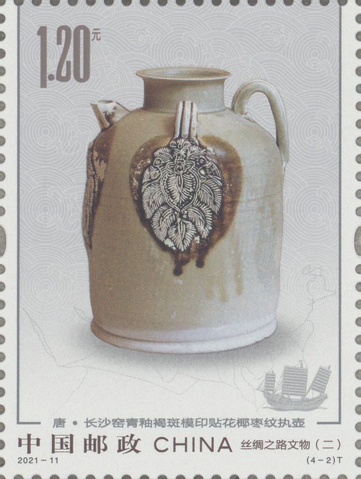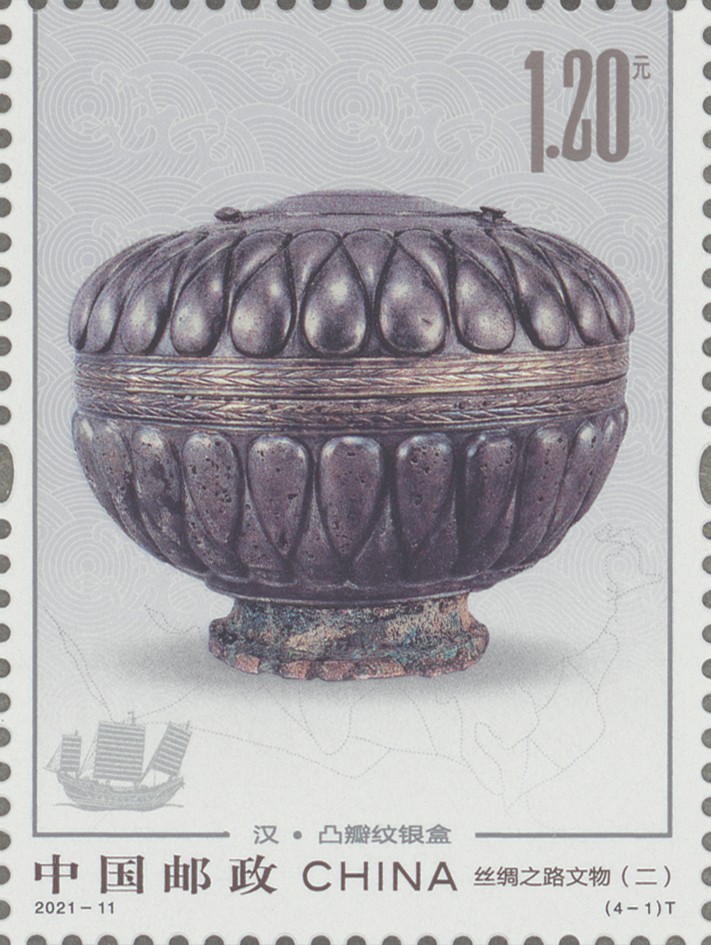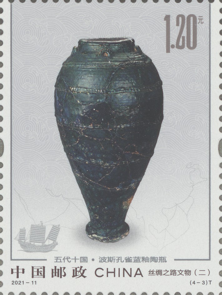 为了弘扬“丝路精神”,中国邮政定于2021年6月12日发行《丝绸之路文物(二)》特种邮票一套4枚,邮票图案内容分别为汉·凸瓣纹银盒、唐·长沙窑青釉褐斑模印贴花椰枣纹执壶、五代十国·波斯孔雀蓝釉陶瓶、宋·龙泉窑青釉菊瓣纹盘。全套邮票面值为4.80元,邮票计划发行数量735万套。