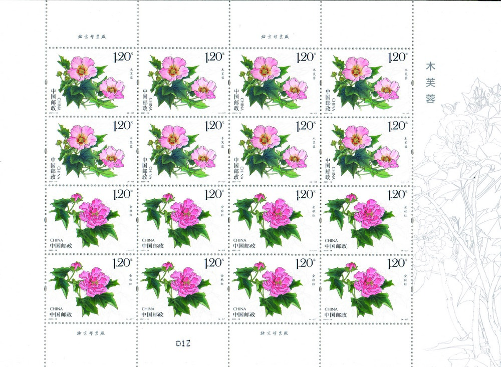 中国邮政定于2021年9月7日发行《木芙蓉》特种邮票1套4枚。详情如下: